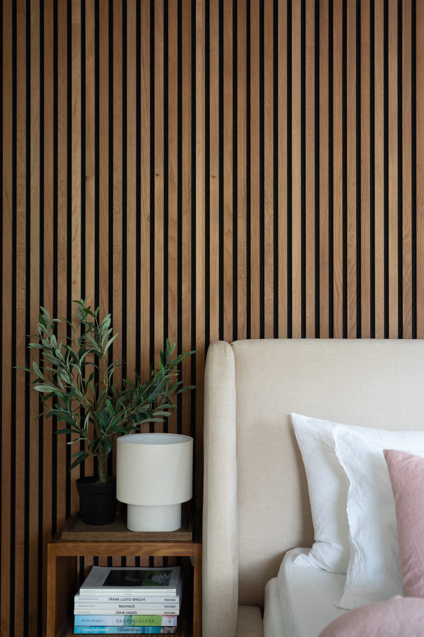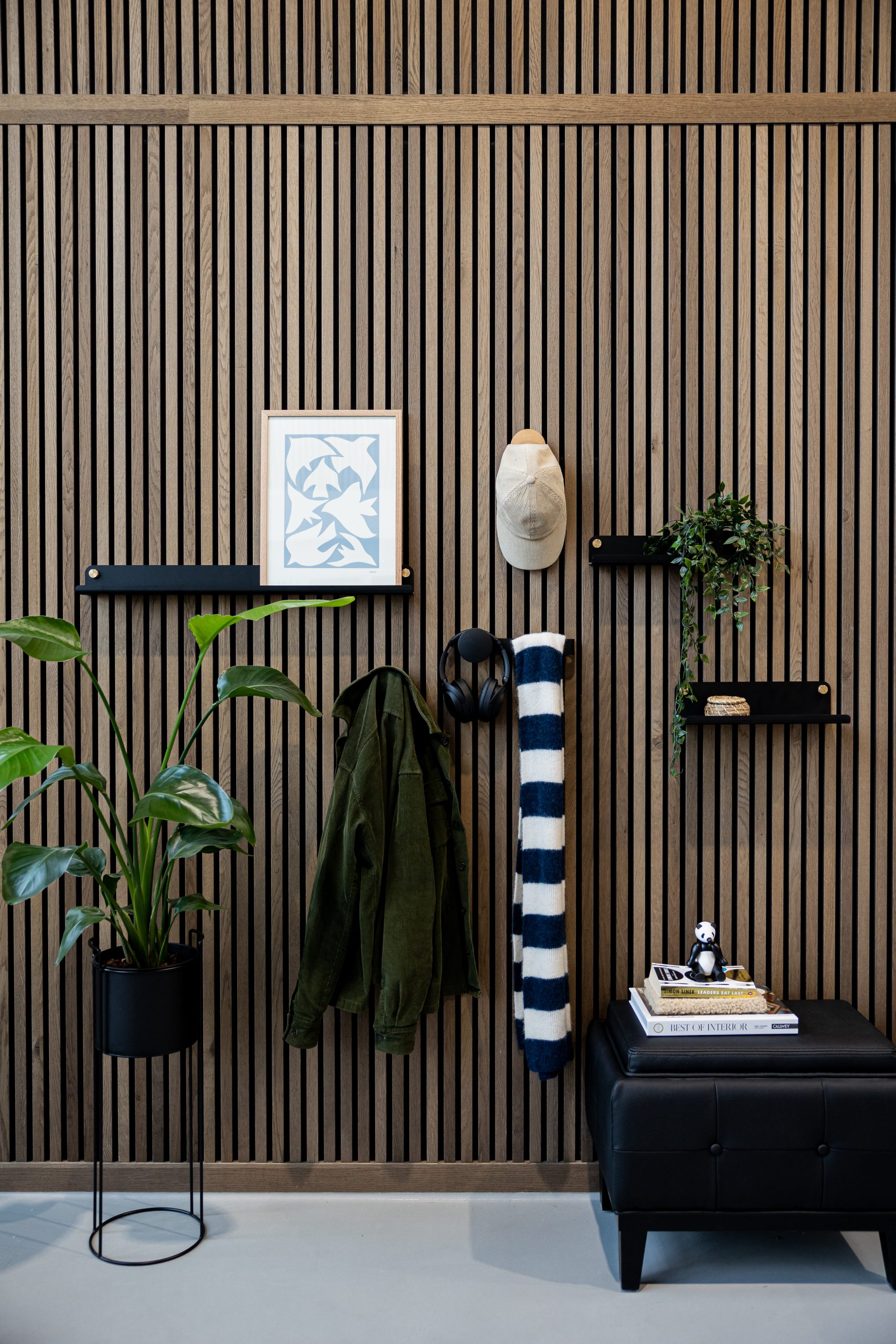 Pannelli acustici quadrati, disponibili in versioni a doghe e in muschio decorativo, pensati per creare pareti ricche di texture e motivi.