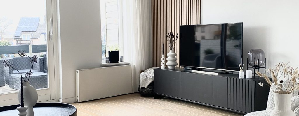 In questo progetto, Anne, appassionata del design Scandinavo, ha dato un’upgrade alla sua “semplice parete bianca” nel soggiorno. Ha optato per i pannelli in rovere classico con feltro nero, che si abbinano perfettamente agli elementi luminosi e in legno del suo interno.
