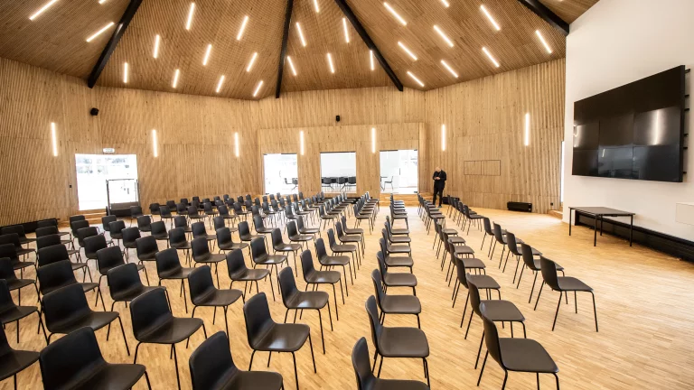 La sala conferenze vanta un vasto spazio aperto al centro, ornato da centinaia di sedie di fronte a un enorme schermo digitale, perfetto per presentazioni durante conferenze più grandi.