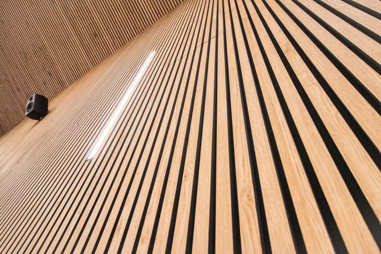 I pannelli sono installati con gusto sia sul soffitto che sulle pareti nell’ampia area aperta, fornendo eccellenti soluzioni acustiche.
