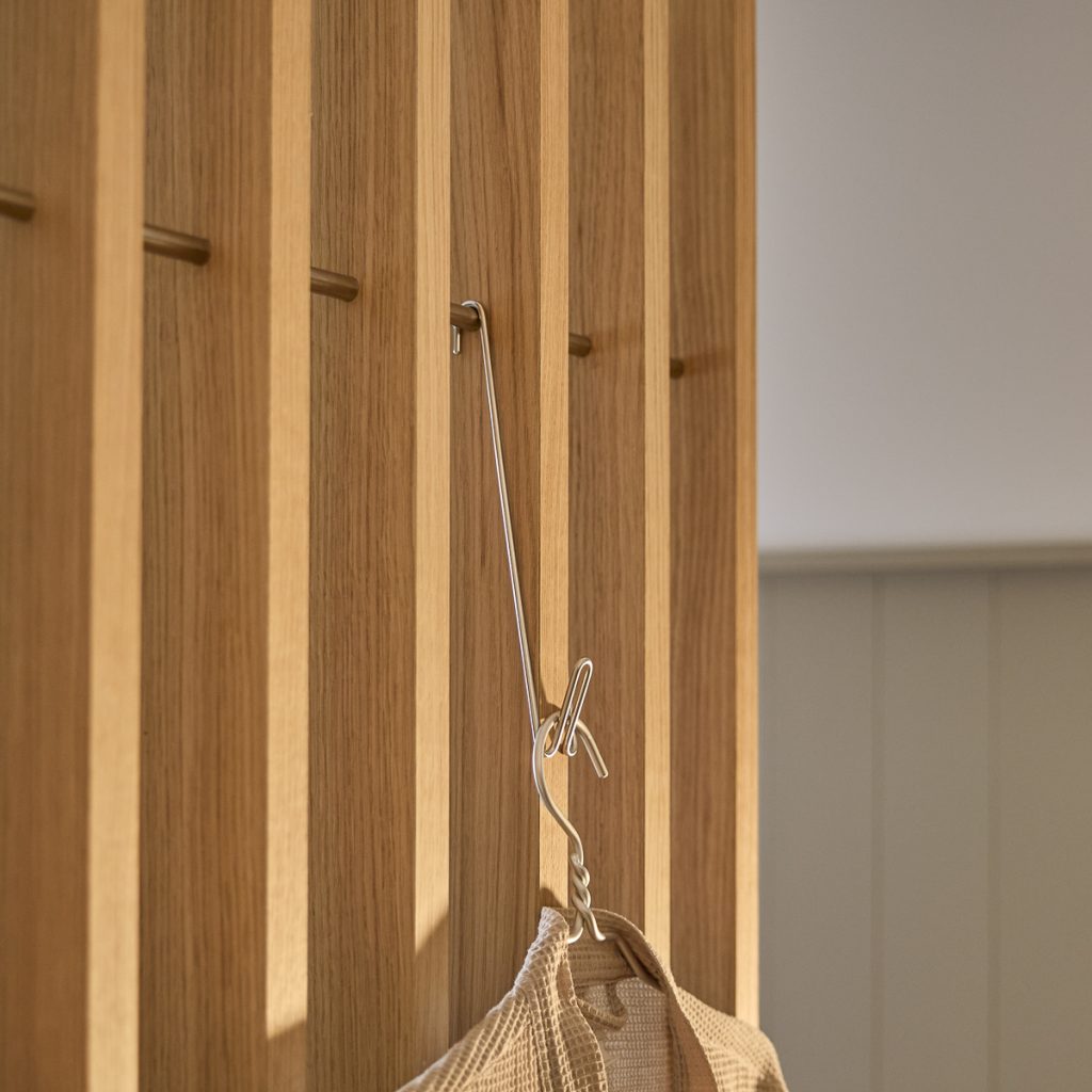 Un gancio più alto per giacche, borse e oggetti più lunghi — o per creare ritmo visivo quando posizionato in linee verticali.