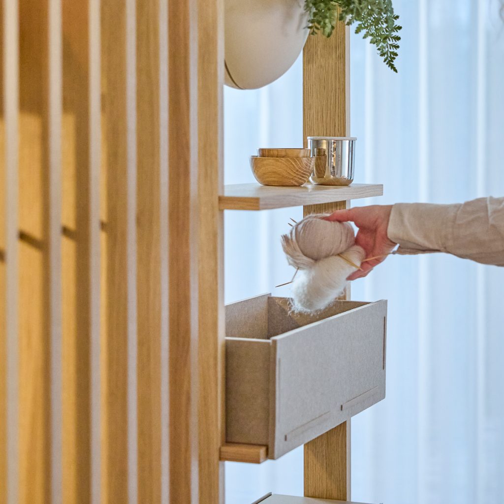 Si adatta alla Lova Wood Shelf — Una volta assemblata, basta posizionare Vigg sulla tua Lova Wood Shelf 3707 per una soluzione di stoccaggio morbida e organizzata.
