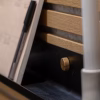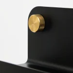 Dettaglio WoodUpp: supporto/piastra in metallo nero opaco con angolo arrotondato e mensola sottostante, fissata da una manopola zigrinata in ottone dorato. Si nota la texture satinata del metallo nero e la finitura scanalata e lucida della manopola in ottone, elegante.