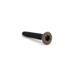 Immagine di una vite WoodUpp per decking: vite singola a testa svasata con impronta Torx a stella, gambo filettato e rivestimento nero anticorrosione, testa marrone opaca per finitura nascosta, progettata per fissaggi su legno e compositi, adatta per esterni ad alta durata.